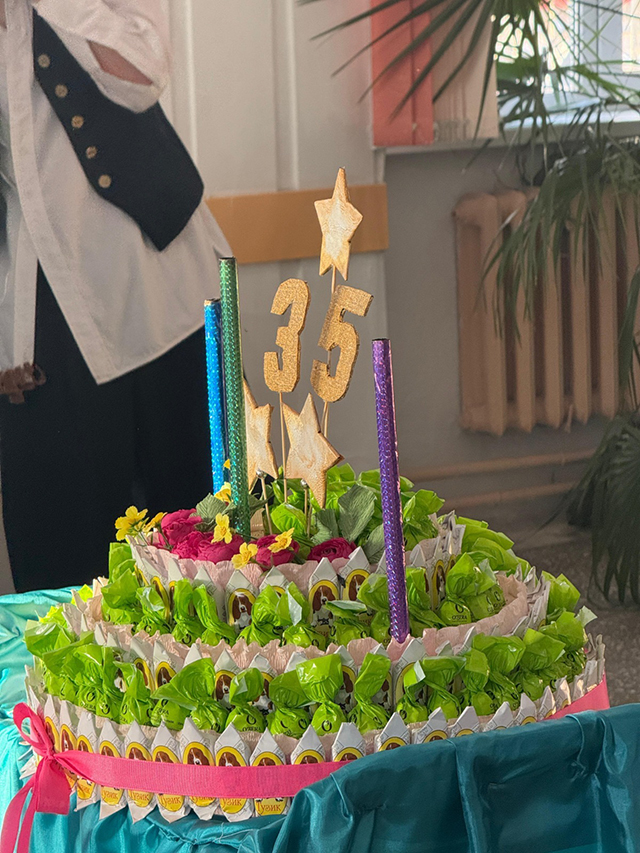 Были вручены подарки и классам: памятные значки «35 лет создаём будущее», блокноты, где расписаны основные вехи становления лицея и, конечно, сладкие призы.