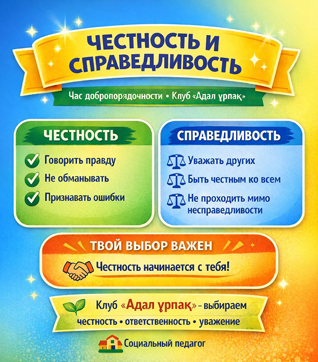 Клуб «Адал ұрпақ» — это возможность не просто говорить о ценностях, а жить ими каждый день. Это занятие проводится в рамках Месячника «Закон и порядок», чтобы мы понимали, что честность и справедливость — не только личные ценности, но и основа соблюдения закона и правил в обществе. Именно эти качества помогают нам быть ответственными, уважать других и быть достойными гражданами.